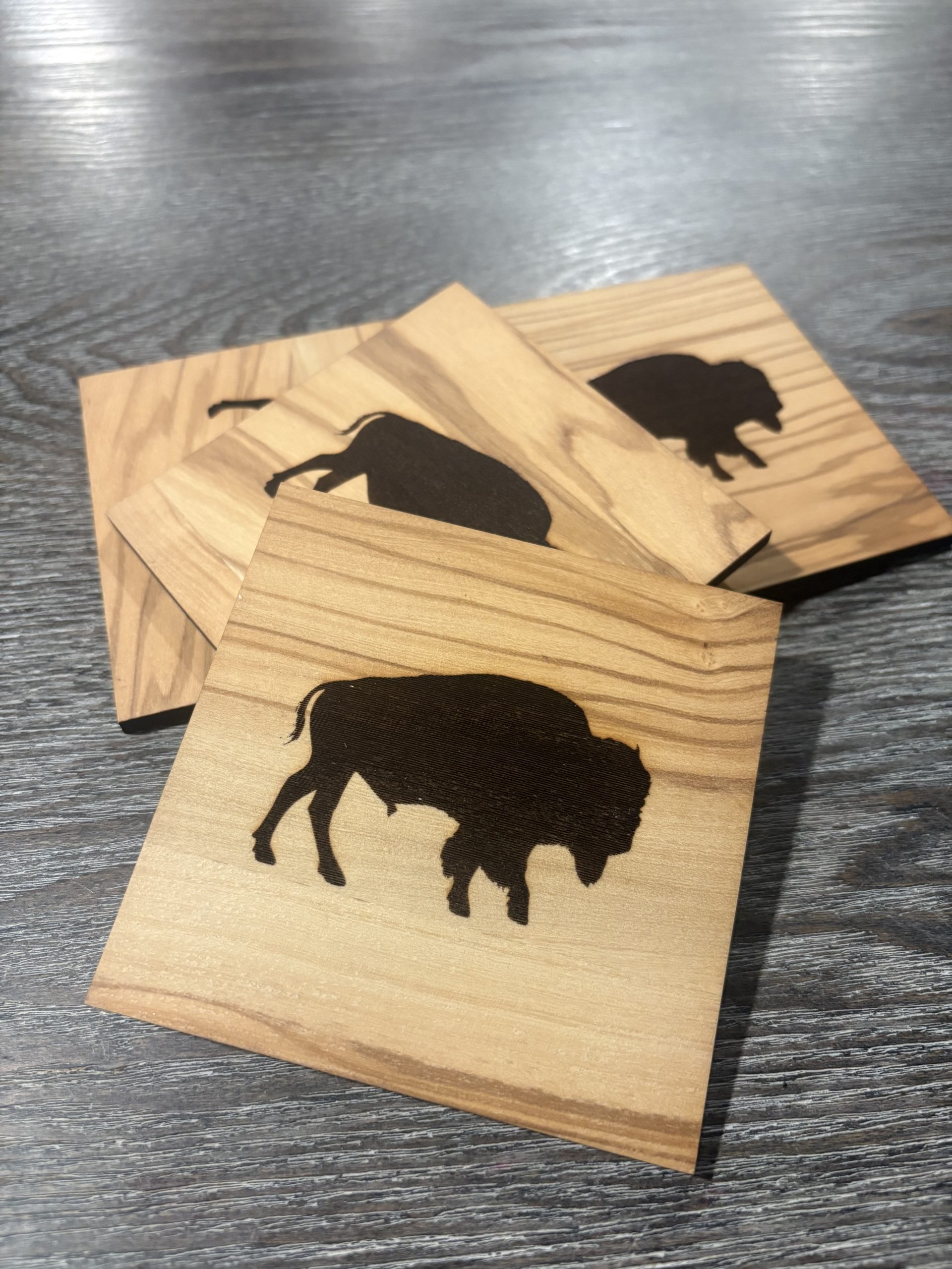 Set of 4 Coasters with a Buffalo Silhouette on them. Engraved in Italian pine wood. buffmfg logo on back.